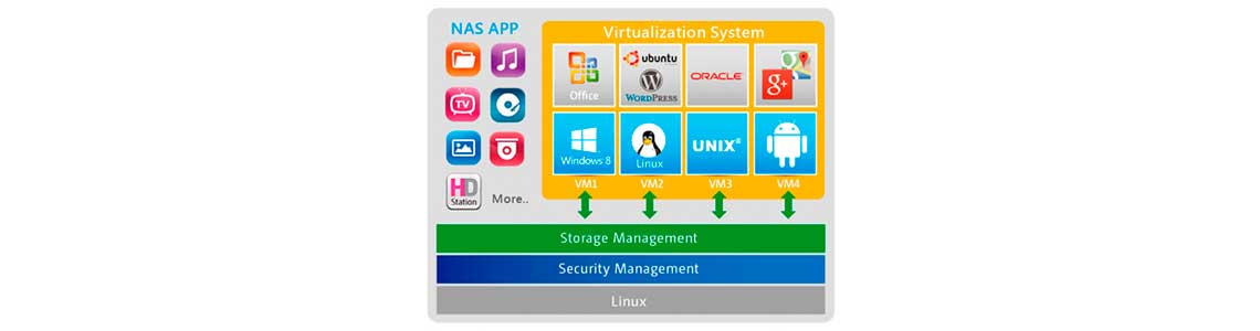 Com essa tecnologia o storage 4 baias Qnap disponibiliza acesso direto aos dados armazenados, execução de aplicativos usando VMs com base em Windows/Linux/UNIX/Android, navegar na web, assistir vídeos Full HD com canais de áudio 7.1 e muito mais.