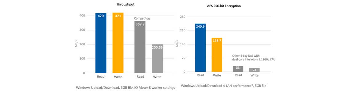 Além disso, o NAS 4 baias TS-453 Pro fornece desempenho sem igual com o sistema de criptografia habilitado, atingindo velocidades de transferência até 70MB/s com segurança AES-256 bits de volume, assegurando a segurança dos dados importantes armazenados.