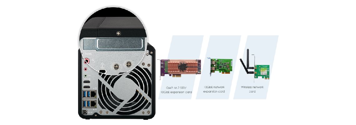 Através do slot PCIe é possível instalar placa com conexão 10Gb para oferecer maiores velocidade de transferências de dados, Placa QM2 para adicionar opções de cache M.2 SSD e uma placa wireless compatível para usar o storage de 4 baias como ponto de acesso sem fio.