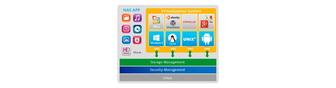 Com o suporte da tecnologia de virtualização Virtualization Station, o storage NAS TS-453U-RP torna-se uma estação de virtualização, plataforma que suporta diversos sistemas operacionais.