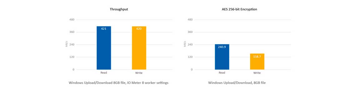 Com encriptação habilitada proporciona velocidades de transferência até 240MB/s com AES-256 bits com criptografia de volume, otimizando a segurança do sistema e garantindo segurança dos dados empresariais armazenadas.