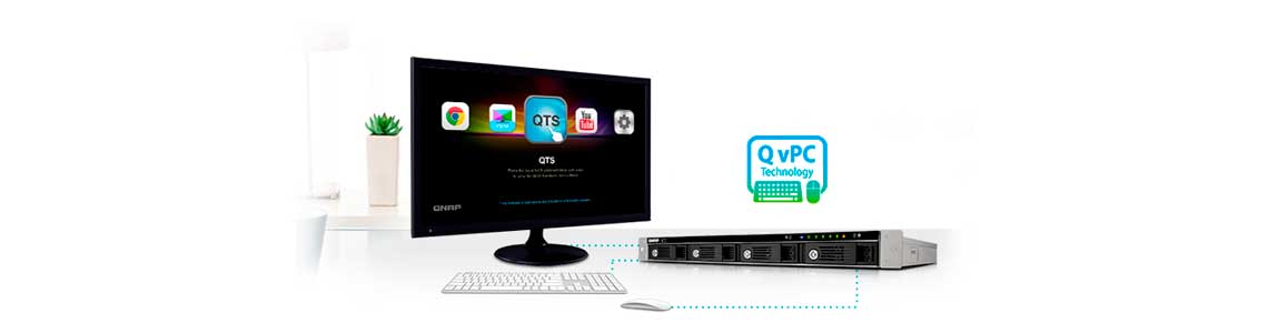 A tecnologia exclusiva Qnap QvPC consolida tecnologias como integração com máquinas virtuais, transcodificação de multimídia, saída HDMI, integração de nuvem e tecnologias de conexão, permitindo assim utilizar o storage rack 16TB como um PC quando conectado a um teclado, monitor e mouse.
