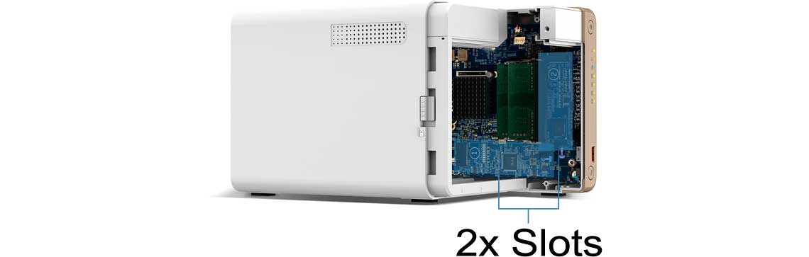 O sistema possui dois slots M.2, permitindo cache SSD ou pools de armazenamento SSD para melhor desempenho, ou Edge TPU para reconhecimento de imagem AI.