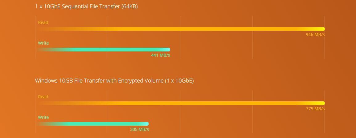 O TS-463XU é equipado com um processador AMD G-Series GX-420MC quad-core de 2.0 GHz de 64 bits e dispõe de 4GB DDR3L (expansível até 16GB), uma porta 10GBE 10GBASE-T, quatro portas Gigabit, além de suportar cache SSD para fornecer desempenho em diversas tarefas. Com uma criptografia AES-NI acelerada por hardware, o NAS 4 baias também fornece alto desempenho de criptografia para garantir a segurança dos dados comerciais armazenados no NAS.