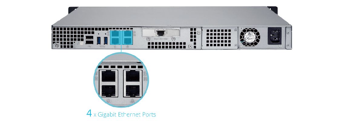 O NAS 4 baias oferece alta capacidade de leitura e eficiência com suporte a Quad-LAN de 1GbE para vários modos de entroncamento de portas, incluindo suporte a failover.