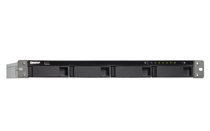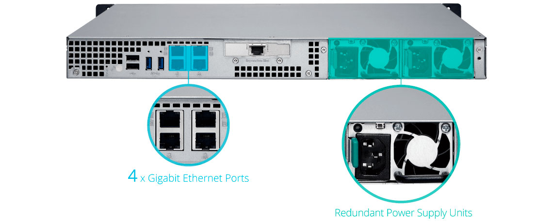 O NAS 4 baias oferece alta capacidade de leitura e eficiência com suporte a Quad-LAN de 1GbE para vários modos de entroncamento de portas, incluindo suporte a failover. Ainda possui fonte de alimentação redundante hot-swap para garantir o máximo de tempo de atividade do sistema.