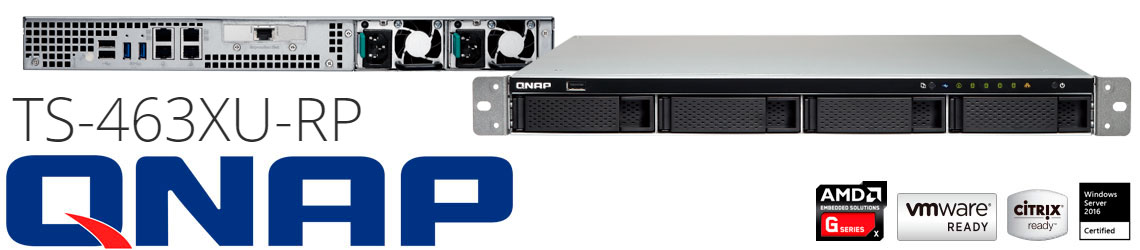 O TS-463XU-RP é equipado com um processador AMD G-Series GX-420MC quad-core de 2.0 GHz de 64 bits e dispõe de 4GB DDR3L (expansível até 16GB), uma porta 10GBE 10GBASE-T, quatro portas Gigabit, além de suportar cache SSD para fornecer desempenho em diversas tarefas.