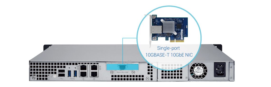 O NAS 4 baias vem com um adaptador de rede Ethernet 10GBASE-T pré-instalado para suportar as redes de alta velocidade de 10GbE.