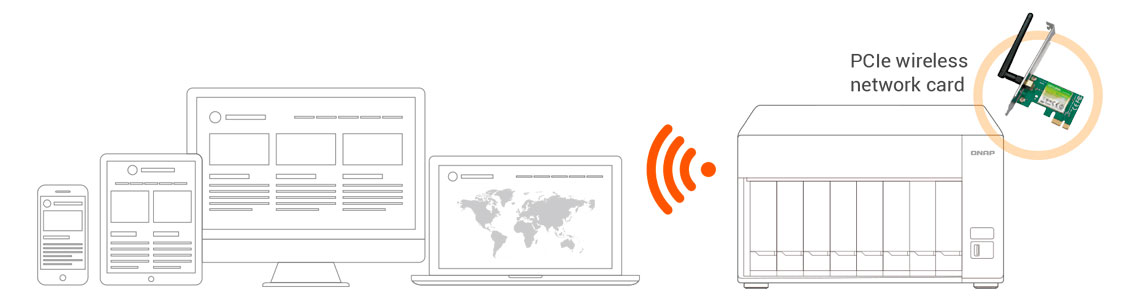 Ao instalar uma placa de rede sem fio PCIe compatível em seu Qnap NAS TS-473, você poderá utilizá-lo como um NAS wireless através do aplicativo WirelessAP Station.