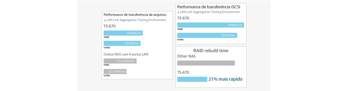 A interface dual-port gigabit pré-instalada no storage 30TB TS-670 pode ser substituída por uma placa 10GbE opcional para entregar altas taxas de transmissão em aplicações que exigem grande volume de IOPS.