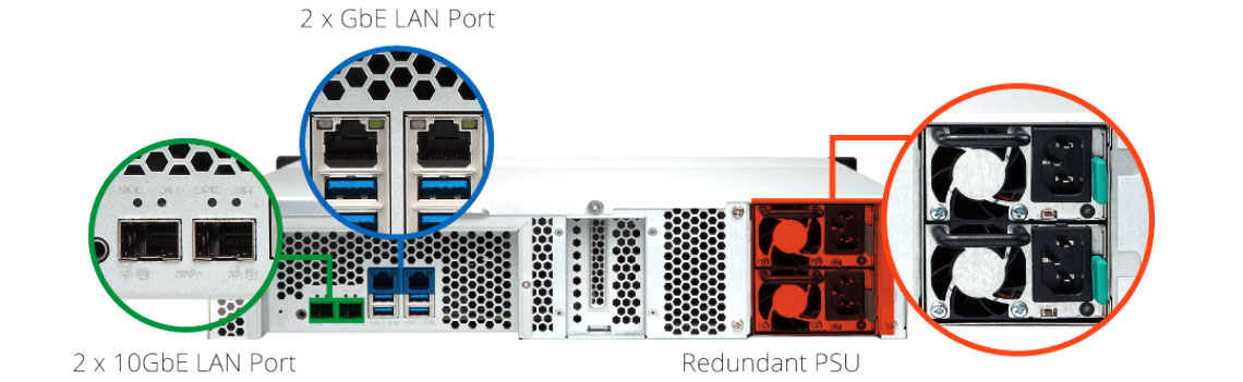 Além de duas portas Gigabit Ethernet integradas, também inclui duas portas 10GbE SFP + para suportar totalmente redes 10GbE de alta velocidade para empresas que exigem maior largura de banda para virtualização, backup e restauração para uma quantidade crescente de dados.