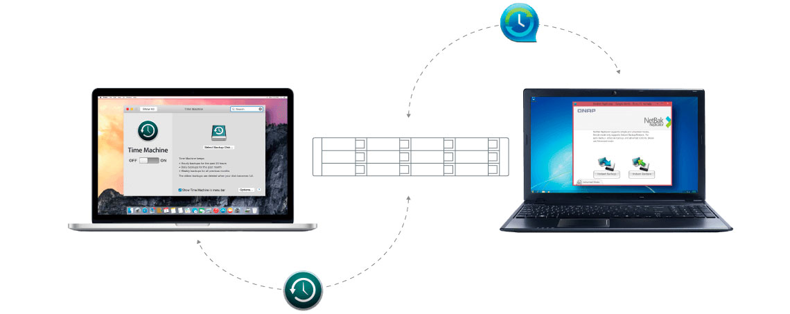 Preparado para lidar com funções de backup de dados em Windows e Mac, o TS-832XU conta com o utilitário de backup NetBak Replicator da Qnap para usuários Windows e oferece compatibilidade com o Time Machine para usuários Mac, podendo ser configurado diretamente no servidor de backup Qnap.