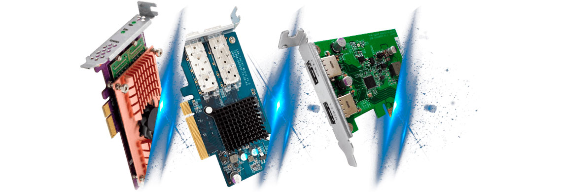 É disponibilizado o slot PCI Express (PCIe) 2.0 x 2 pelo storage para expandir as funcionalidades NAS, como por exemplo a instalação de portas 10GBASE-T adicionais e SSDs M.2, placa USB 3.0 e placa wireless para ponto de acesso sem fio.