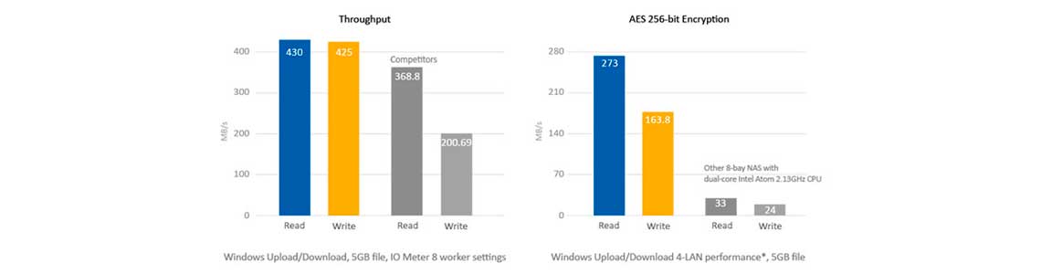 Além disso, TS-853 Qnap alcança taxas de transferência de até 70MB/s em volumes com criptografia com AES-256 bits, incrementando a performance e segurança do sistema.