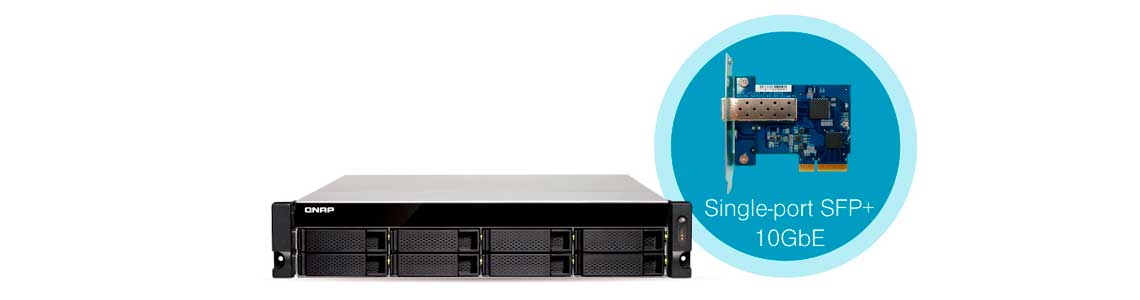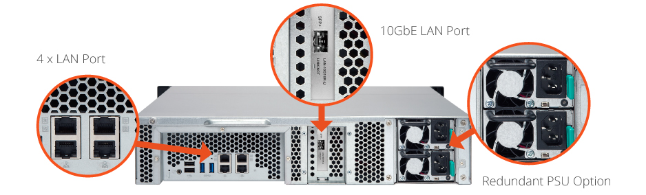 O NAS Qnap suporta rede 10G via placa de rede 10GbE SFP+ já inclusa, além das 4 portas Ethernet padrão. O adaptador de rede SFP+ 10GbE pode ser substituído por um 10G BASE-T ou um adaptador 10GbE de 2 portas, garantindo a flexibilidade e diversas possibilidades de entroncamento de dados no storage rack.