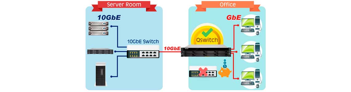 Com o aplicativo Qswitch o Qnap TS-863U-RP suporta ligação entre redes de 1Gigabit e 10Gigabit naturalmente como um switch de rede.