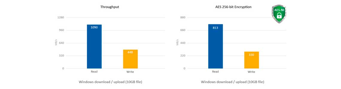 O mecanismo de encriptação acelerada por hardware do Qnap TS-863U-RP proporciona até 813MB/s em AES-256 bits, aumentando assim a segurança dos dados armazenados.