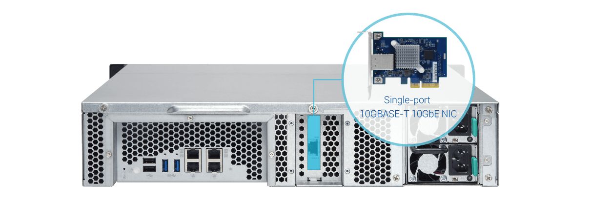 O TS-863XU-RP vem com um adaptador de rede Ethernet 10GbE pré-instalado para suportar as redes de alta velocidade de 10GbE. Juntamente com o sua alta capacidade de armazenamento, o Qnap NAS é ideial para empresas armazenarem grande quantidade de dados e usufruir de maior flexibilidade de TI.