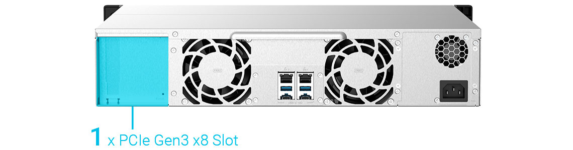 O storage TS-873AU possui um slot PCIe Gen 3 x8, que permite incluir funcionalidades adicionais através de uma placa PCIe compatível. Utilizando um adaptador adequado, a bifurcação PCIe é suportada, permitindo que o usuário use duas placas PCIe Gen 3.