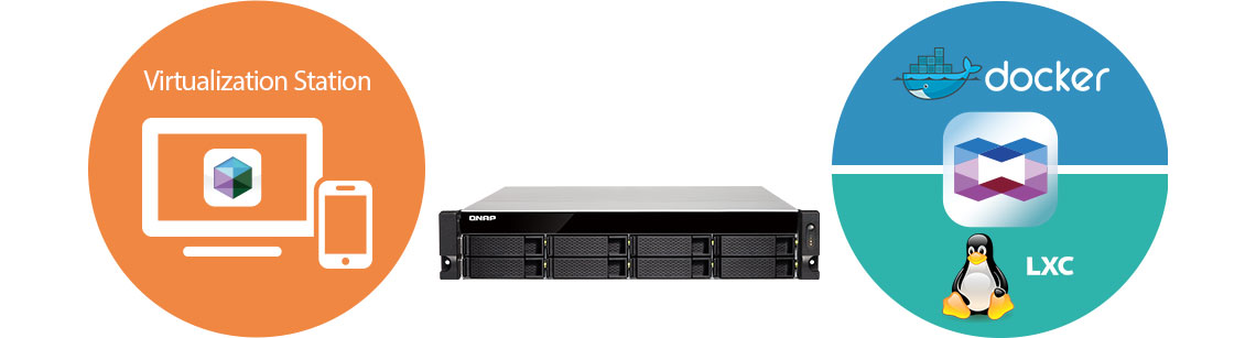 A Virtualization Station permite que você hospede uma Virtual Machine (VM) no TS-873U-RP e consiga acesso pelo navegador ou pela Virtual Network Computing (VNC), enquanto o Container Station integra tecnologias de virtualização leves como o LXC e Docker® para operar múltiplos sistemas Linux isolados.