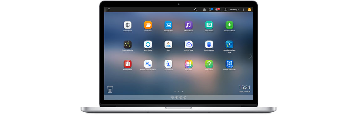 A interface do QTS é totalmente intuitiva que conta com um desktop inteligente, que permite que o usuário ache as funções desejadas com mais facilidade, monitoramento do sistema em tempo real.