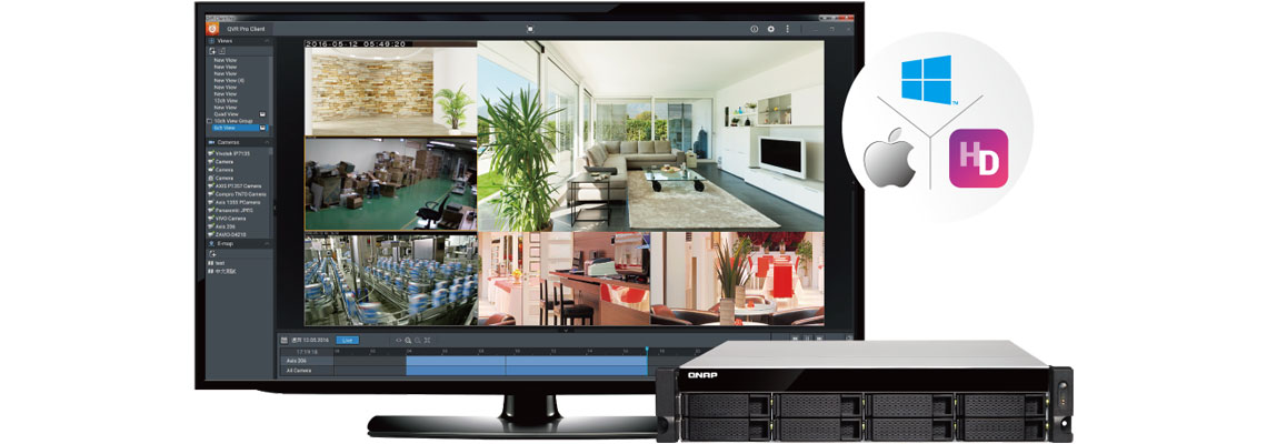 O QVR Pro, oferece uma interface flexível, que permite ajustar as proporções e monitorar câmeras IP, suporta a função linha do tempo que permite pesquisa instantânea no vídeo e uma rápida identificação no modo monitoramento ao vivo ainda permite exibições de monitoramento e playback sem trocar de janelas.