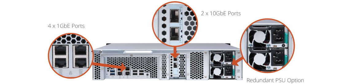 Equipado com o AMD série R RX-421ND quad-core 2.1 Ghz, memória DDR4 Dual Channel expansível até 64 GB, o servidor NAS garante desempenho quando se fala em armazenamento de dados, além de possuir quatro portas de 1GbE e uma placa de rede de duas portas 10GbE pré-instalada.