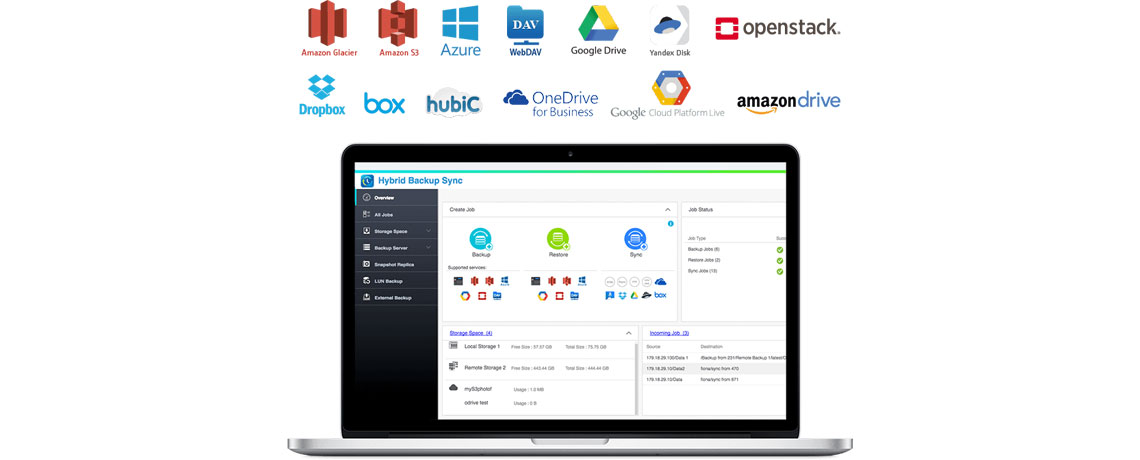 Tambem suporta Hybrid Backup Sync, que conta com funções de backup, restauração e sincronização, RTRR, rsync, FTP, CIFS/SMB, com isso você consegue fazer transferência para armazenamentos locais, armazenamento remoto e nuvem.