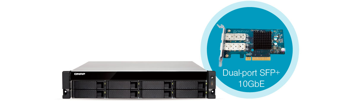 O TS-873U-RP suporta conexões de alta-velocidade 10GbE, com adaptador de rede contando com duas portas 10GbE SFP+ PCIe, suportando altas taxas de transferência para empresas que precisam de uma grande demanda de tráfego para suas operações do dia-a-dia.