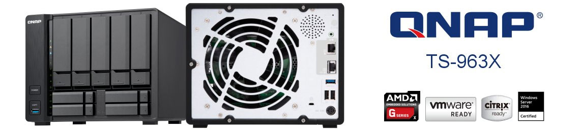 O Qnap TS-963X dispõe de processador AMD G-Series Quad-Core 2,0 GHz, 9 baias (Quatro baías são para hard drives de 2,5 polegadas que podem ser usados para implementar cache SSD e Tecnologia Qtier), 126TB de capacidade de armazenamento, 2GB ou 8GB de RAM, 1 porta 10GBASE-T de 5 velocidades para até 10GB conectividade, 1 porta LAN gigabit 3 conexões USB 3.0.