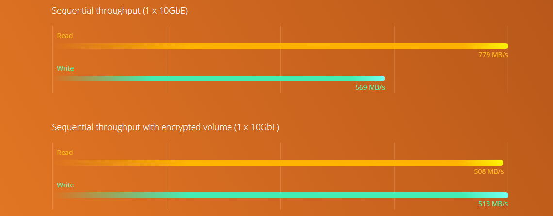 Através das quatro baias para SSDs 2,5 polegadas e da porta 10GBASE-T, O NAS Qnap pode atingir até 779/569 Mbps (não criptografado) de taxa de transferência para leitura/gravação e até 508/513 Mbps (Criptografia de volume AES-256 com aceleração AES-Ni).