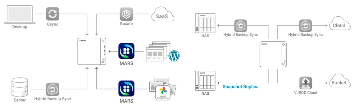 Backup do Google Fotos e WordPress: O serviço exclusivo MARS permite fazer backup de bancos de dados e arquivos do Google Fotos e do WordPress no NAS.