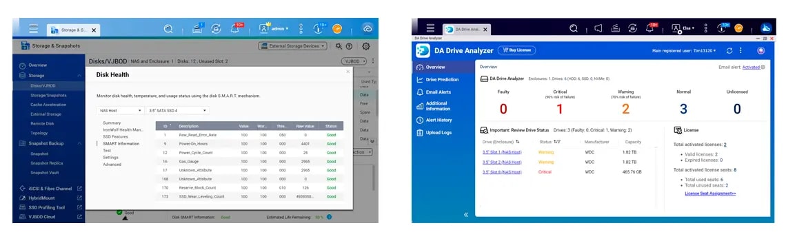 DA Drive Analyzer: O DA Drive Analyzer utiliza IA baseada em nuvem ULINK para prever a vida útil prevista das unidades, ajudando-o a planear futuras substituições de unidades para se proteger contra tempo de inatividade do NAS e perda de dados.