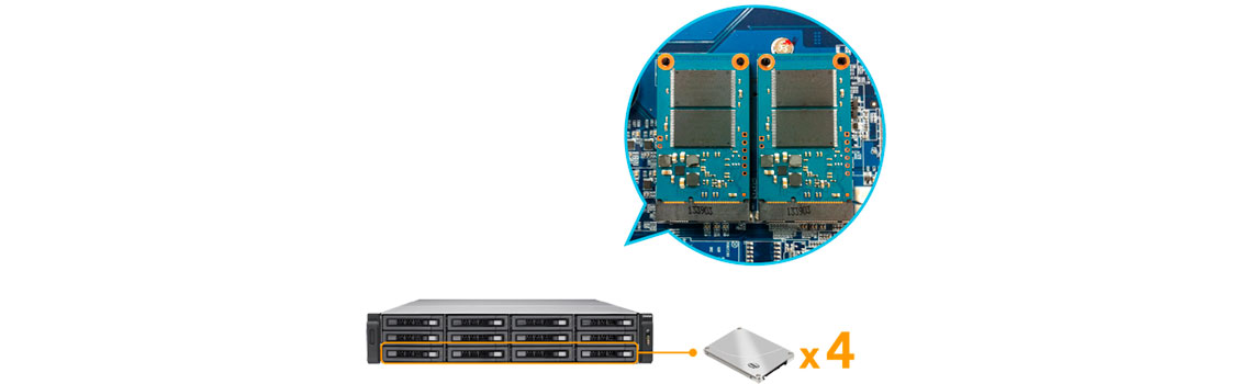 O TVS-EC1280U possui 2 módulos mSATA pré-instalados e não há limites para o uso de SSDs para armazenamento em cache. Ao instalar SSDs de alto desempenho, a eficiência dos IOPS nos volumes de armazenamento pode ser elevado. É perfeito para melhorar o fluxo de trabalho geral de aplicativos que exigem IOPS aleatórios, como banco de dados e virtualização. O design da porta interna de cache reserva o espaço da bandeja do disco rígido para maior capacidade de armazenamento.