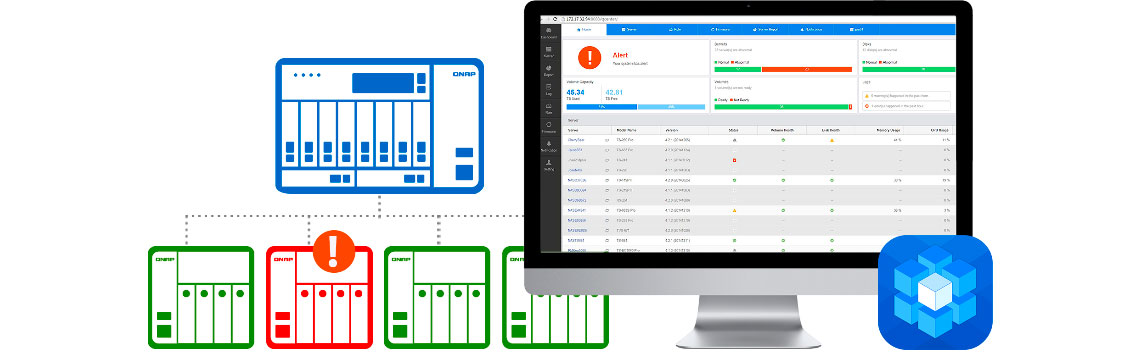 O Qcenter transforma o TVS-EC1680U-SAS-RP em um sistema de gerenciamento central para gerenciar várias unidades do NAS. Após a instalação do Qcenter no QTS App Center, é possível usar o storage para gerenciar centralmente o QNAP NAS de vários sites para monitorar os logs do sistema, gerenciar atualizações e manutenção de firmware e aproveitar os principais benefícios, incluindo facilidade de uso, custo-benefício, conveniência e flexibilidade. O gerenciamento de vários storages se torna fácil e eficiente.