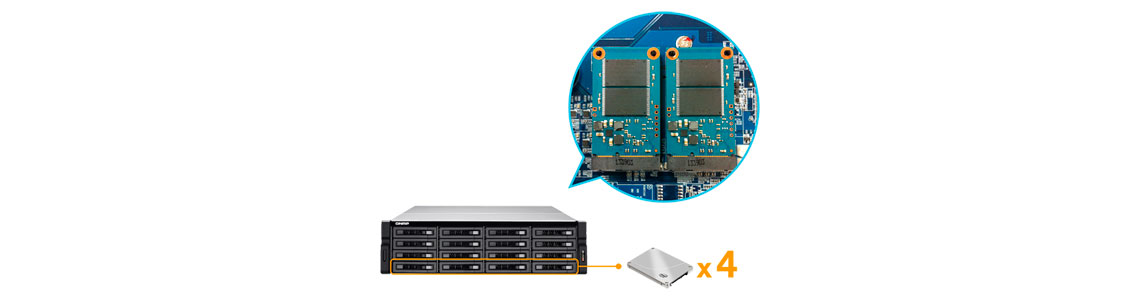 O TVS-EC1680U-SAS-RP possui 2 módulos mSATA pré-instalados e não há limites para o uso de SSDs para armazenamento em cache. Ao instalar SSDs de alto desempenho, a eficiência dos IOPS nos volumes de armazenamento pode ser elevado. É perfeito para melhorar o fluxo de trabalho geral de aplicativos que exigem IOPS aleatórios, como banco de dados e virtualização. O design da porta interna de cache reserva o espaço da bandeja do disco rígido para maior capacidade de armazenamento.