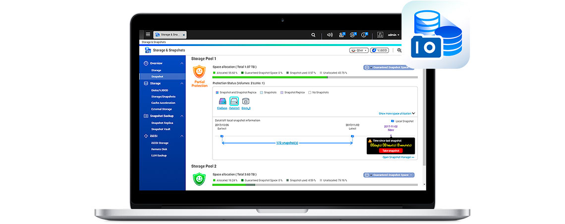 O QTS Storage Manager adiciona uma ferramenta de snapshot baseada na Web de fácil uso, como fazer backup e restaurar facilmente os dados e arquivos no TVS-EC1680U-SAS-RP para evitar a perda de dados importantes. É possível tirar snapshots para volumes e LUN, replicar eficientemente para servidores remotos, copiando apenas as alterações feitas e clonar rapidamente um snapshot de volume / LUN como um volume local sem interromper a operação atual do sistema. Pode-se configurar o sistema para tirar automaticamente um snapshot do volume antes do backup via RTRR / rsync, mesmo quando o arquivo é aberto.