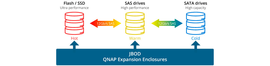 A tecnologia Qtier da QNAP equipa o TVS-EC1680U-SAS-RP com a classificação automática através de níveis, que ajuda a melhorar o desempenho do armazenamento. Com o Auto Tiering, o storage pode mover automaticamente os dados quentes para camadas de armazenamento de alta eficiência e dados frios para unidades de menor custo e maior capacidade, tornando o TVS-EC1680U-SAS-RP um recurso compartilhado extremamente eficiente. As empresas não precisarão mais investir em tecnologia Flash dispendiosa, mas ainda poderão aproveitar o desempenho dos aplicativos e reduzir o TCO de armazenamento do Auto Tiering com o storage.