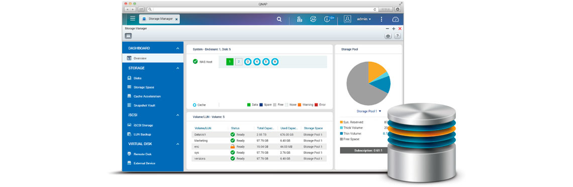 O volume flexível da QNAP fornece uma maneira mais segura de armazenar dados do NAS. Esse volume de última geração oferece recursos mais avançados, como pool de armazenamento com proteção de vários grupos RAID, volume provisionado thin com recuperação de espaço, LUN iSCSI em nível de bloco e expansão da capacidade on-line. O QTS Storage Manager apresenta comodamente ferramentas e opções para gerenciar o armazenamento do sistema, o que simplifica o processo de expansão da capacidade do NAS e o gerenciamento do JBOD da QNAP RAID.