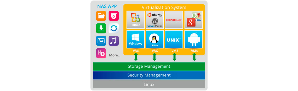 O NAS suporta VMware VAAI e Microsoft ODX para aumentar o desempenho, descarregando o carregamento do servidor para ESXi e Hyper-V, e suporta também o plug-in QNAP vSphere Client e o provedor QNAP SMI-S com eficiência aprimorada de operações e gerenciamento em aplicativos de virtualização.