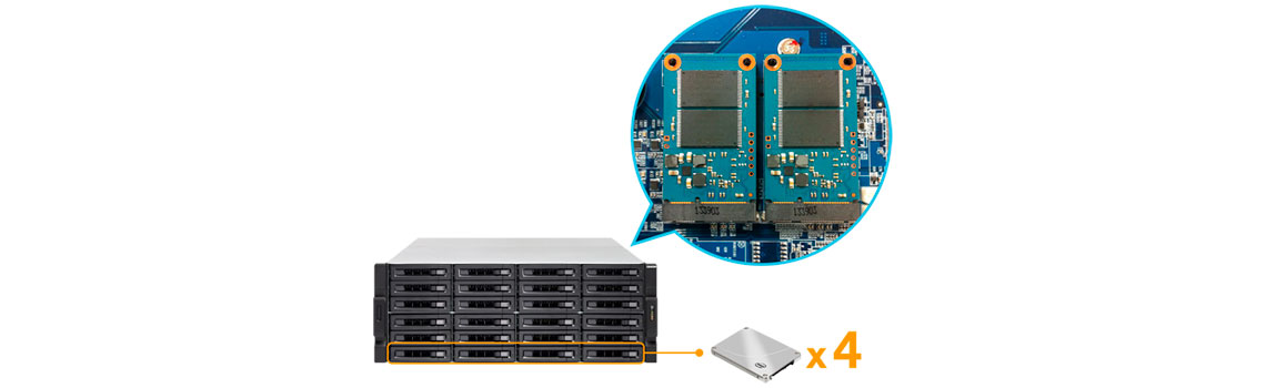 O TS-EC2480U R2 possui duas portas internas de cache mSATA e até 4 SSDs podem ser utilizados para o armazenamento em cache. Ao instalar módulos flash mSATA, o desempenho IOPS dos volumes de armazenamento pode aumentar.