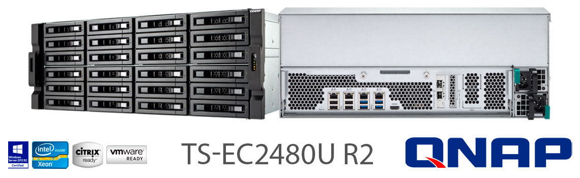 O Qnap TS-EC2480U R2 oferece 24 baias hot swappable para discos SATA. Equipado com processador Intel Xeon v3 quad-core, 4GB RAM, e 4 portas Gigabit Ethernet de 10GbE.