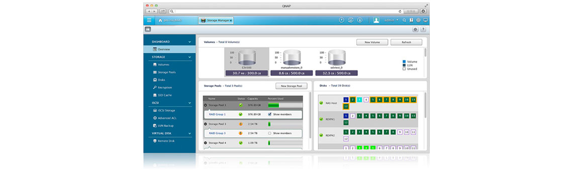 O QTS Storage Manager apresenta comodamente ferramentas e opções para gerenciar o armazenamento do sistema, o que simplifica o processo de expansão da capacidade do NAS e o gerenciamento do gabinete de expansão QNAP RAID.