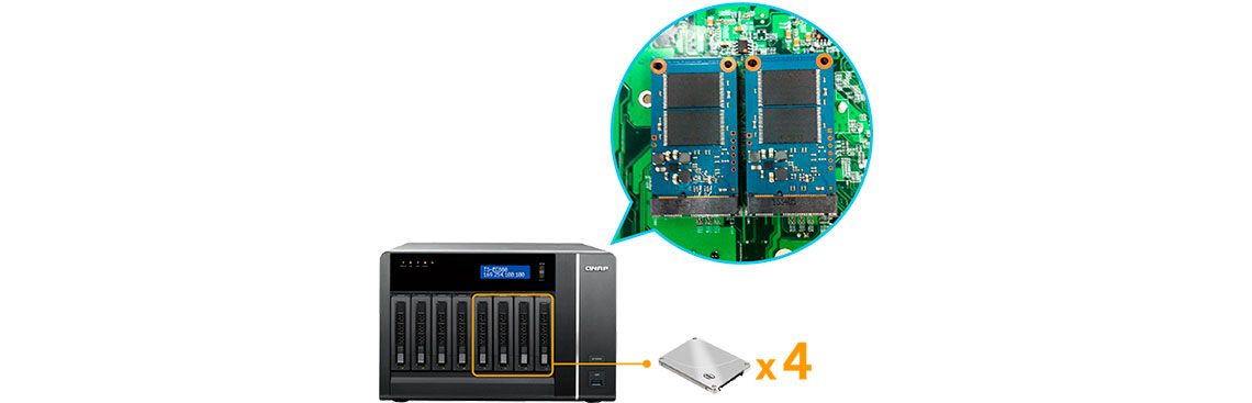 O TS-EC880 Pro suporta duas portas internas de cache mSATA e até 4 SSDs como cache. Ao instalar os módulos flash mSATA (compra opcional), a funcionalidade IOPS dos volumes de armazenamento pode aumentar notavelmente.