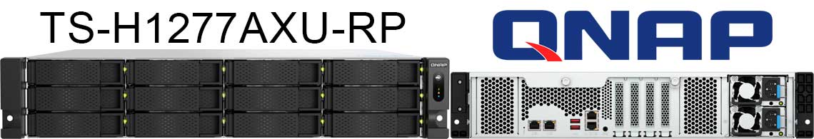 O TS-h1277AXU-RP da Qnap possui 12 baias para discos SATA/SSD, hot swappable, fontes redundantes, processador AMD Ryzen 6-core, 16GB de memória DDR5, 4x portas LAN, 2x entradas USB e 3x slots PCIe.