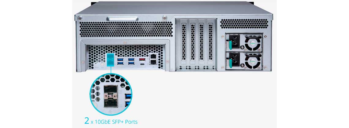 O TS-h1677XU-RP suporta duas portas 10GbE SFP+ SmartNIC (com um controlador NVIDIA Mellanox ConnectX-4 Lx SmartNIC) que possui extensões iSCSI para RDMA (iSER) para melhorar o desempenho de transferência de dados e descarregar cargas de trabalho de CPU entre um storage NAS e ESXi.
