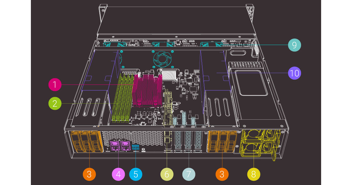 O servidor é equipado com um processador Intel Xeon D quad-core, 32GB de memória DDR4 ECC (expansível para 128 GB) e o sistema possui um desempenho de alta performance.