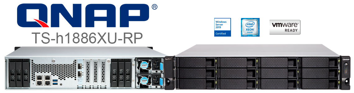 O TS-h1886XU-RP Qnap é um NAS de 12 baias para discos SATA e 6 slots de SSD, hot swappable, fontes redundantes, equipado com um processador Intel Xeon D, 32GB de memória DDR4 (expansível até 128 GB), 2x portas USB 3.2 e 4x LAN.