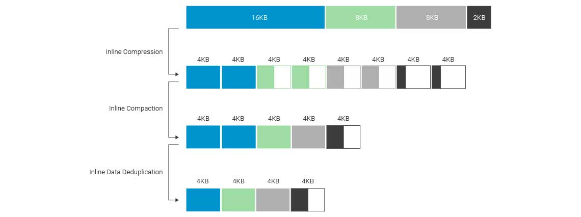 O QuTS hero suporta tecnologias avançadas de redução de dados baseadas em blocos (incluindo eliminação de duplicados, compressão e compactação de dados online) para reduzir o tamanho dos arquivos, conservar a capacidade de armazenamento e otimizar o desempenho.