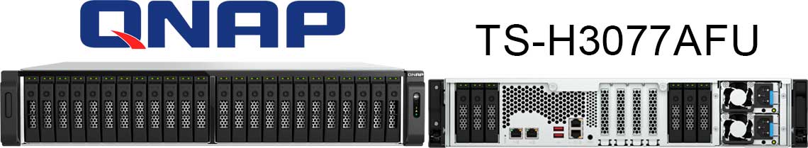 O TS-h3077AFU é um storage NAS de 30 baias para memórias SSD, hot swappable, processador AMD Ryzen 6-core, 32GB de memória DDR5 (expansível até 128GB), 4x portas LAN, 2x conexões USB e 3x slots PCIe.